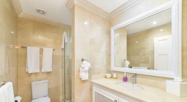 THE MAIN HOUSE HAS TWO ENORMOUS BEDROOMS WITH EN-SUITE BATHROOMS . THE 3RD BEDROOM IS SMALLER WITH ITS OWN ADJACENT BATHROOM - ALL HAVE HAIRDRYERS.